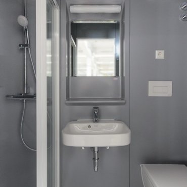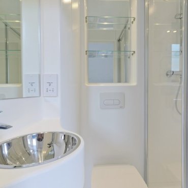 The Kienfichte retirement home in Dessau relies on prefabricated bathrooms made of GRP (glass fibre reinforced plastic) and also follows different tracks regarding their colour concept. However, this doesn't pose a problem to Sanika, as the possible choices cover the full RA...